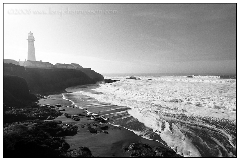 Keywords: lighthouse, beach, coast, pacific ocean, california, pigeon point, landscape, black & white, film, youth hostel, waves, seashore